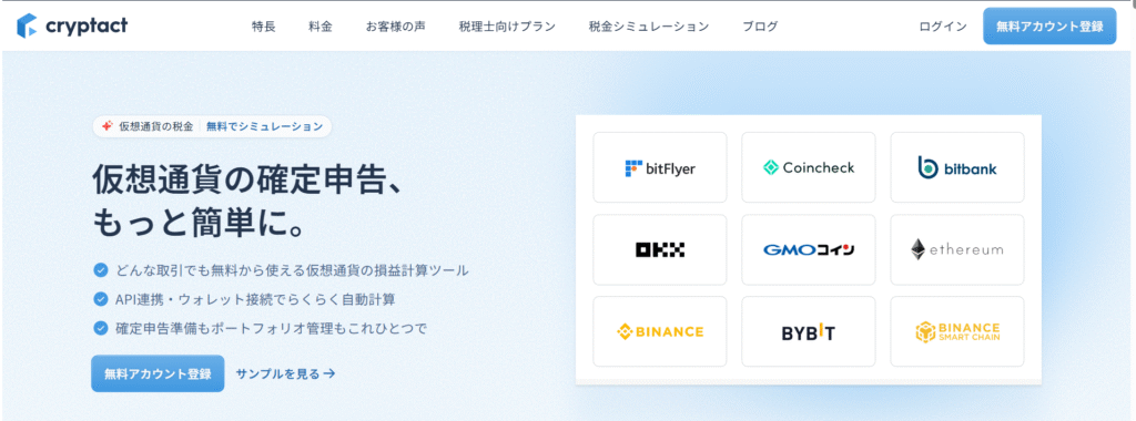 cryptactは、国内外の取引所やDeFi・NFT取引をFreeプランから利用できる損益計算ツールです。株式会社pafinが提供しており、国内利用者数はトップクラスを誇ります。