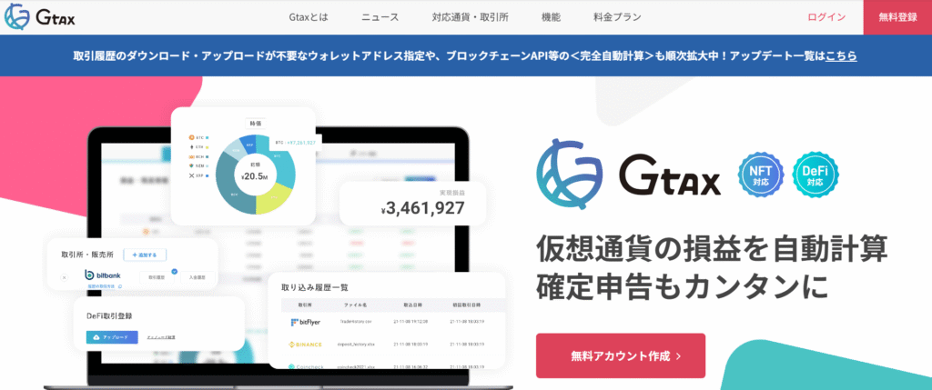 Gtaxは2017年から提供されている仮想通貨の損益計算ツールで、国内外70以上の取引所やウォレットに対応しています。