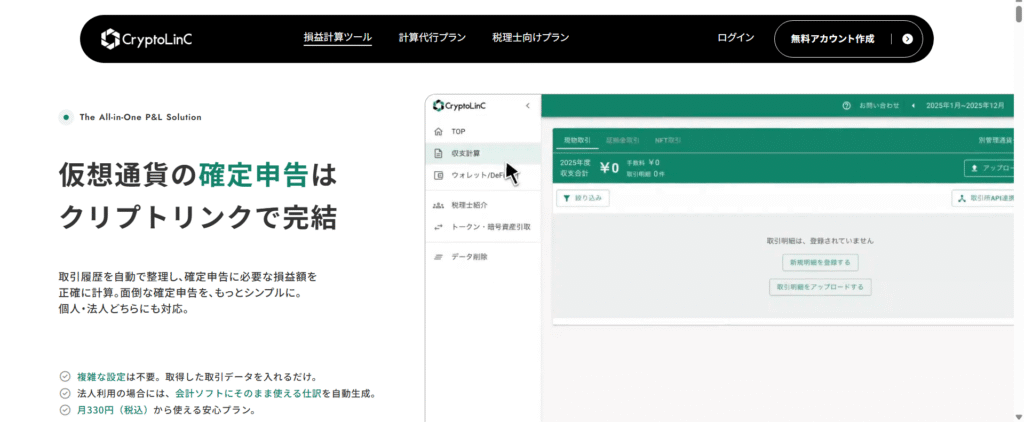 cryptolincの個人向けプランは年間3,960円から利用できる、コストパフォーマンスに優れた税金計算ツールです。