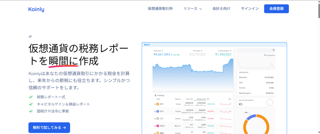 Koinlyは海外発のツールですが、日本語にも対応した国際的な税金計算サービスです。